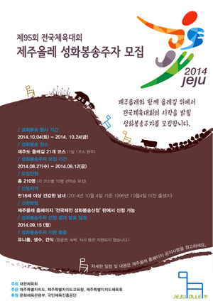 한편 제주특별자치도 전국체전기획단은 “제주의 매력을 가장 잘 보여줄 수 있는 제주올레 길을 걸으며 성화봉송을 개최하게 되어 뜻깊다”며 “아름다운 섬 제주에서 제 95회 전국 체육대회가 성공적으로 치뤄질 수 있도록 많은 제주도민들의 신청과 관심을 바란다”고 말했다.