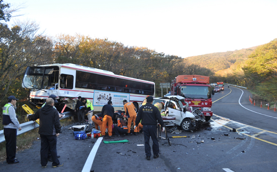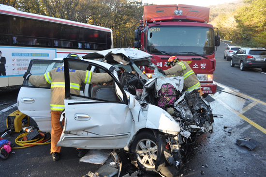 이 사고로 승용차 운전자 한모(67)씨와 승용차에 타고 있던 김모(55·여)·노모(55·여)씨 등 3명 숨졌다. 강모(47·서귀포시)씨 등 11명이 중·경상을 입어 제주대병원과 서귀포의료원 등으로 옮겨져 치료를 받고 있다.
