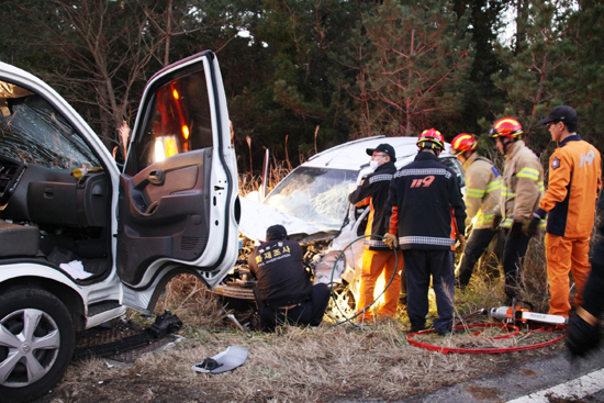 6일 오후 5시34분께 서귀포시 호근동 시오름입구 제2산록도로에서 박모(54, 서귀포시)씨가 몰던 1톤 트럭과 송모(여, 34, 서귀포시)씨가 몰던 마티즈 승용차가 정면 충돌했다.