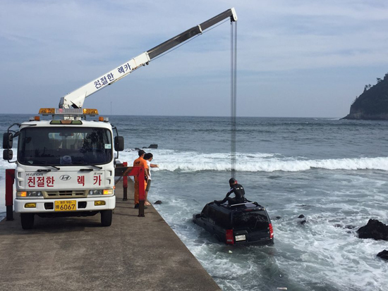 서귀포해경에 따르면 서울에서 관광온 송모씨(50) 등 2명은 이날 오후 3시 55분경 보목동 구두미 동편 방파제에서 운전 중, 바닥 이끼류에 차량이 미끄러지면서 해상으로 추락했다.