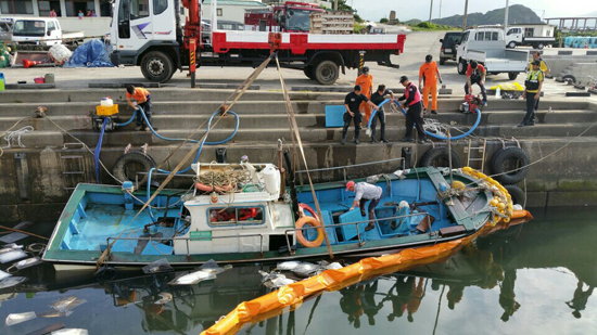 해경은 오일펜스를 설치하는 등 방제작업을 실시하는 이날 오전 9시 경 크레인을 이용 D호를 인양했다.