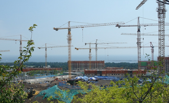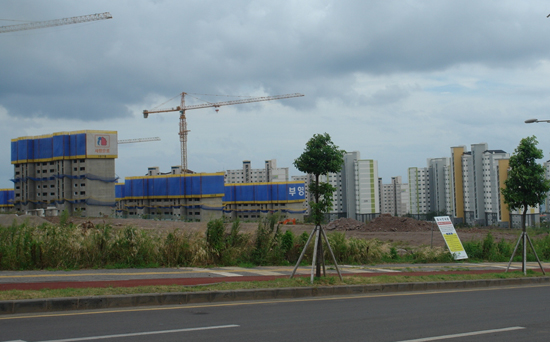 제주 혁신도시 서쪽 인근의 강정 택지지구에도 공동주택 건설이 활기를 띠고 있다.