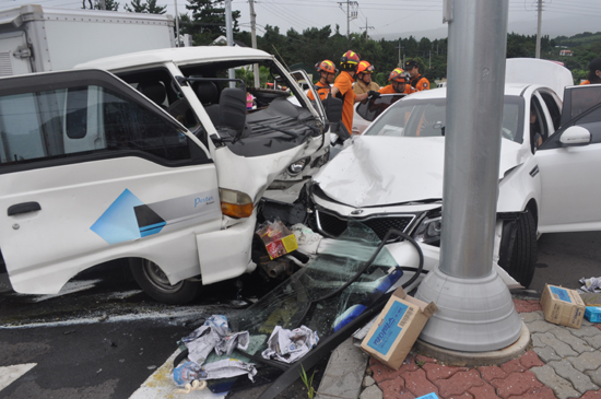 25일 오후 1시12분께 서귀포시 엉또폭포 입구 교차로에서 차모씨(52, 상예동)가 운전하던 1톤 트럭과 김모씨(37, 경기도 안양)가 운전하던 렌터카가 충돌해 8명이 중경상을 입는 사고가 발생했다.
