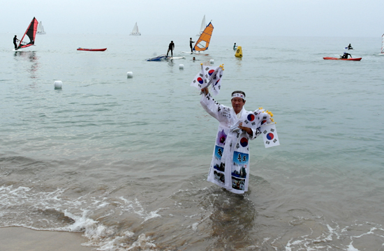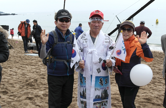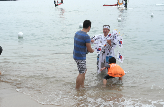 2일 중문색달해변에서 열린 펭귄수영대회에서 태극기하르방 한규북씨가 참가자들을 대상으로 태극기를 나눠주며 '독도는 대한민국 땅'을 강조했다.