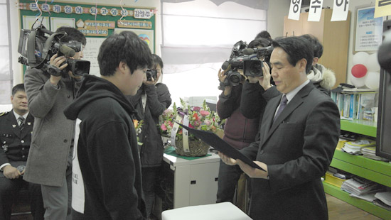졸업을 축하하기 위해 마을 주민들과 지역 단체장 등이 학교로 몰려들었다. 졸업식을 취재하기 위한 방송국 카메라도 여럿 자리를 잡고 졸업식이 시작되길 기다렸다.