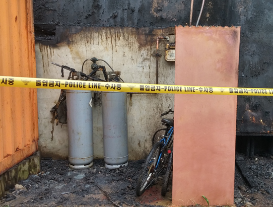 건물 외부에서 발생한 화재는 외벽 일부를 태우고 진화됐다. 인근에 LPG가스통이 놓여 있었지만 다행히 사용하지 않는 것으로 큰 피해를 면했다.
