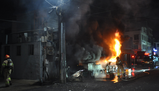 서귀포소방서에 따르면 9일 새벽 4시 20분 경 천지동 3층 건물의 한 음식점에서 화재가 발생했다. 소방차량이 현장 도착 당시 화염이 건물 밖으로 분출되고 있는 상태으며, 이 불은 오전 4시 37분 경 완전히 진화됐다.