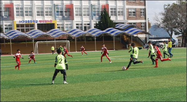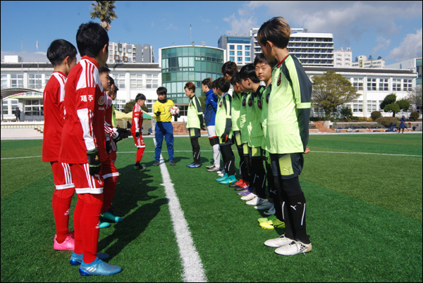 이번 대회 최강으로 꼽히는 부천FC와 외도초등학교의 경기는 우여곡절 끝에 서귀포초등학교로 옮겨 치러졌다. 중문에 비해 조금 낫기는 했지만, 서귀포의 날씨도 짓궂기는 마찬가지. 천막이 바람에 주저앉기를 여러 차례 반복했다. 경기를 제대로 치를 수 있겠냐는 우려가 곳곳에서 들렸지만 경기에 임하는 선수들 눈빛은 흔들림이 없다.