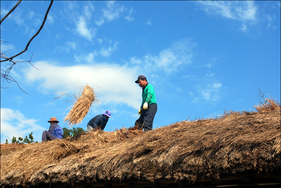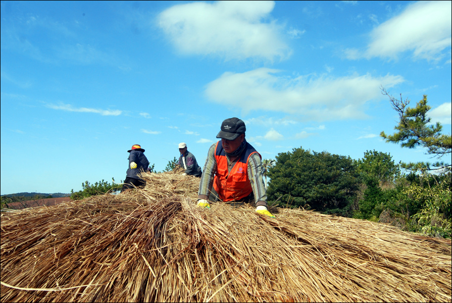 이러한 일들은 사라져가는 풍경이 됐다. 그 사라져가는 풍경을 기억하기 위해 제주민속촌으로 갔다. 마침 날씨는 화창했고, 아저씨 여럿이 지붕을 잇고 있다. 일하는 솜씨를 보니 해마다 일을 해온 베테랑들이다.