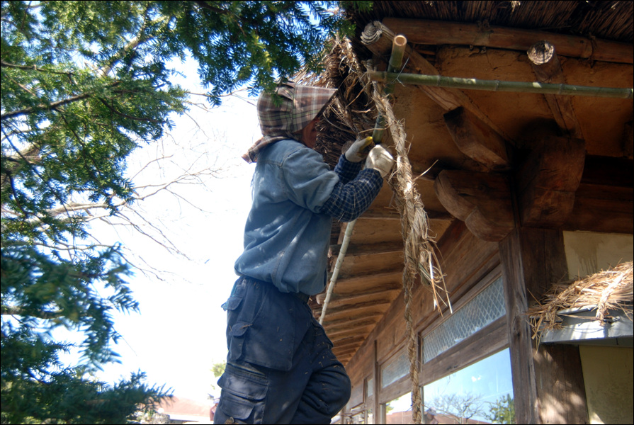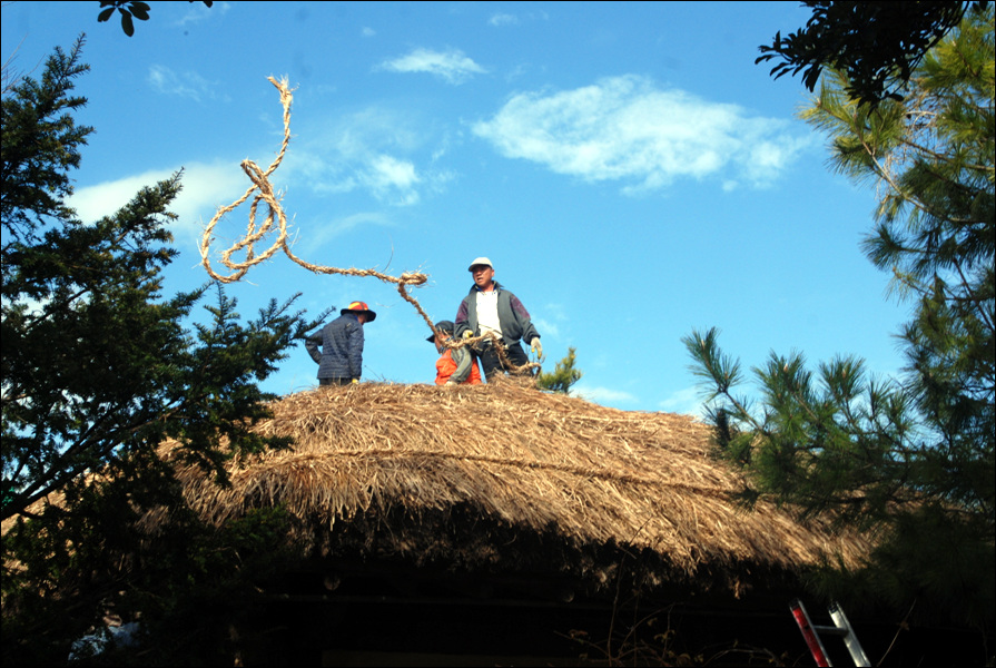 주붕 위에서 작업하는 사람들이 집줄을 가로세로로 펴주면, 지붕 아래서는 집줄의 끝단을 거왕대에 묶어 단단히 고정해주었다. 이렇게 지붕교체가 끝나면 가위를 이용해 처마 끝을 가지런하게 잘라준다. 일이 마무리되면 청소하는 일만 남는다.