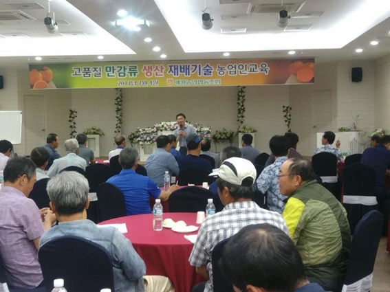 애월농협(조합장 강경남)은 지난 4일 본점 대회의실에서 만감류 공선출하회 회원 및 관내 재배농가 80여명이 참석한 가운데 제주농업기술센터 송상철 박사를 초빙하여 고품질 만감류 생산을 위한 재배기술 영농교육을 실시했다.