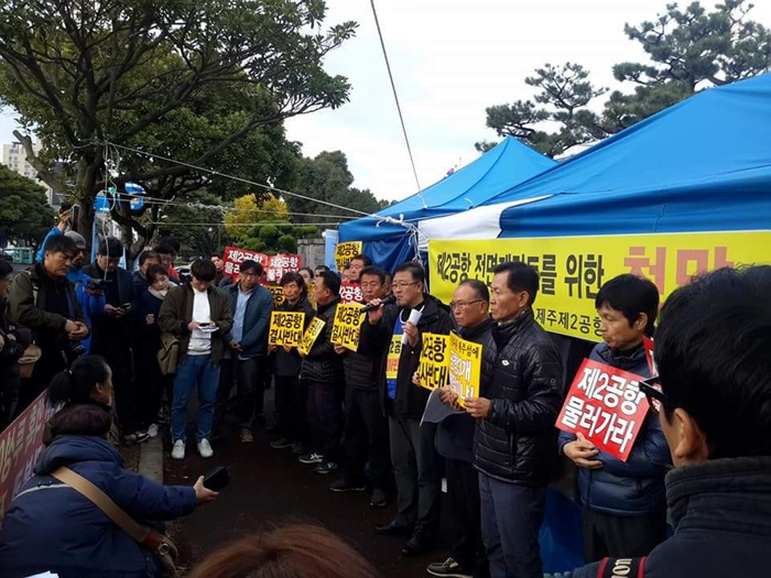 김경배 성산읍대책위 부위원장은 국토부가 2015년에 발표한 ‘제주 제2공항 사전 타당성조사 용역’(제주 공항인프라 확충 사전 타당성 조사검토 용역)에 대한 재조사를 요구하며 지난 10월 10일 제주도청 앞에서 천막단식에 들어갔다. 그의 단식이 장기화되자 원희룡 지사도 부담을 느껴 주민들과 간담회를 열였다.
