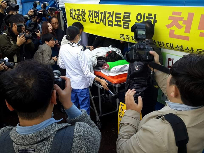 김 부위원장이 이송된 후에 성산읍대책위는 기자회견을 이어갔다. 성산읍대책위는 “42일간 목숨을 건 절규에도 불구하고 끝내 국토부는 말장난에 불과한 답변서로 우리들을 분노하게 만들었다”고 비난했다. 그리고 “사전타당성 용역에 문제가 많으니 그것을 검증하고 그 결과에 따라 기본계획용역 발주 여부를 결정하자는 요구가 무리한 요구인가"라며 분통을 터트렸다.