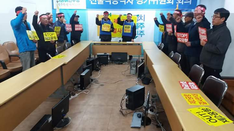 ‘제주 제2공항 반대를 위한 성산읍대책위원회’(이하 성산읍대책위) 소속 주민들이 28일 저녁 더불어민주당 제주도당 당사를 점거했다. 이들은 “제주 제2공항은 보수정권의 적폐 사업”이라며 “더불어민주당은 제2의 4대강 제주 제2공항 계획을 재검토하라”고 요구했다.