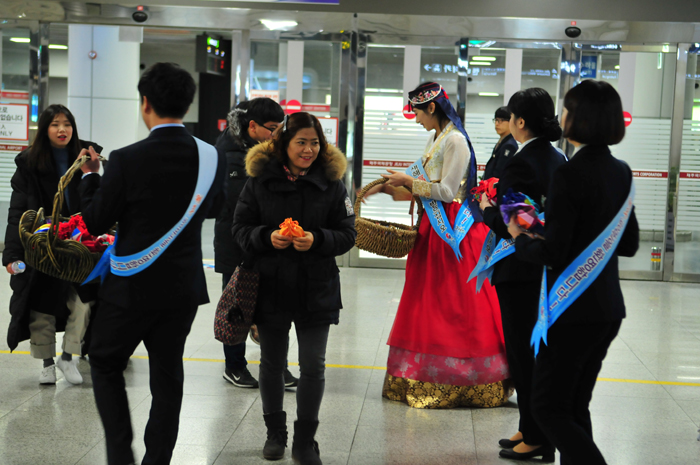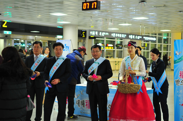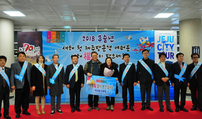 제주특별자치도와 제주특별자치도관광협회(회장 김영진)는 2018년 무술년(戊戌年) 새해 첫날을 맞이해 제주국제공항에서 첫 입도 국내·외 관광객에게 건강과 행복을 기원하고, 제주방문 감사의 마음을 담은 환영행사를 벌였다.