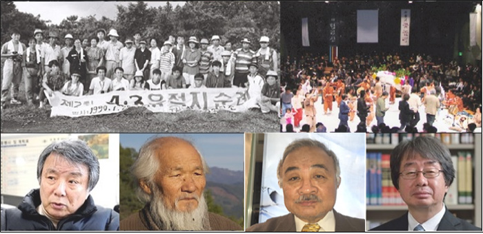 ▲ 위쪽 1990년 4·3연구소의 4‧3유적지 순례와 2003년 도쿄에서 놀이패 한라산의 마당극. 아래 왼쪽부터 양동윤, 김명식, 고이삼, 문경수 수상자