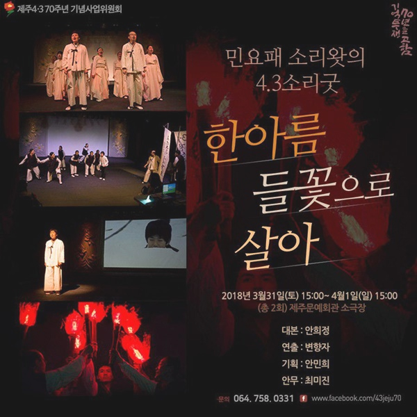 오는 3월 31일과 4월 1일, 제주문예회관 소극장에서 펼쳐지는 민요패 소리왓의 4.3 소리굿 ‘한아름 들꽃으로 살아’는 지난 2008년 초연된 후 2010년, 2015년 총 세 차례 4.3특별공연으로 공연됐던 작품을 조금 더 보완해 무대에서 선보인다.