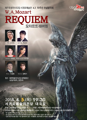 도립서귀포예술단은 4월 5일 오후 7시 30분부터 서귀포예술의전당 대극장에서 ‘4.3 70주년 추념음악회-모차르트 레퀴엠’을 개최한다.