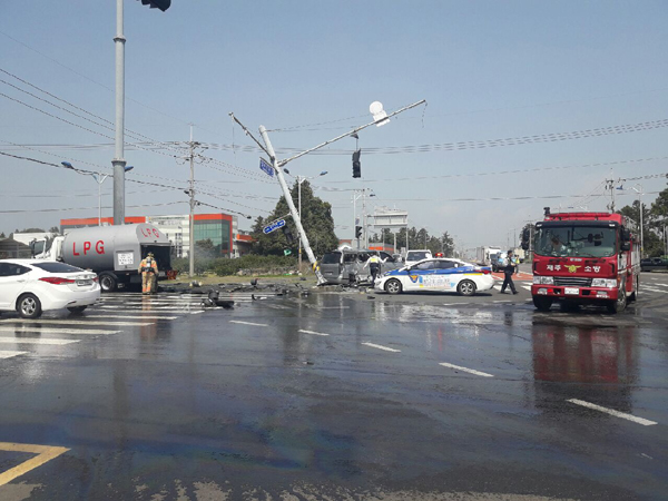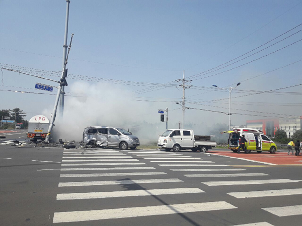 이날 사고는 성산에서 남원 방면으로 운행중이던 LPG 운반 탱크로리 차량과 표선에서 번영로 방면으로 진행하던 스타렉스 봉고 차량이 충돌하면서 스타렉스 차량은 신호대기중이던 1톤 화물차와 재충돌하는 사고로 이어졌다. LPG 운반 차량은 인도변 고정신호등 기둥 충돌로 화재까지 발생했다.