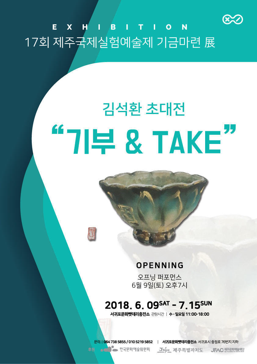 자연과 영혼의 생명력을 매개하는 전천후 아티스트 김석환의 이번 전시 “ 기부& TAKE 전 ”은 매년 예술제 예산 마련에 어려움을 겪고 있는 한국의 대표적인 퍼포먼스 예술제인 17회 제주국제실험예술제(JIEAF)의 후원기금 마련을 위한 나눔과 배품의 정신으로 마련되었다.
