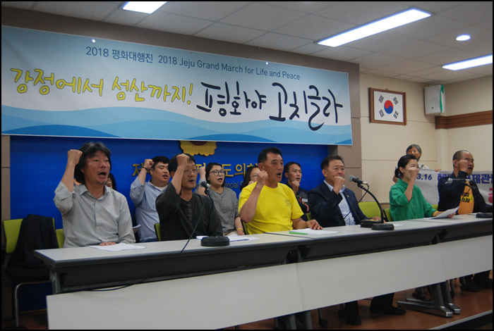 강정마을해군기지반대주민회(이하 ‘반대주민회’)와 제2공항 성산읍반대대책위(이하 ‘성산읍대책위’), 제주해군기지 전국대책위, 제주군사기지저지와평화의섬실현을위한범도민대책위원회(이하 ‘범도민대책위’)는 5일 오전 11시, 제주도의회 도민의방에서 2018제주생명평화대행진 기자회견을 열었다.