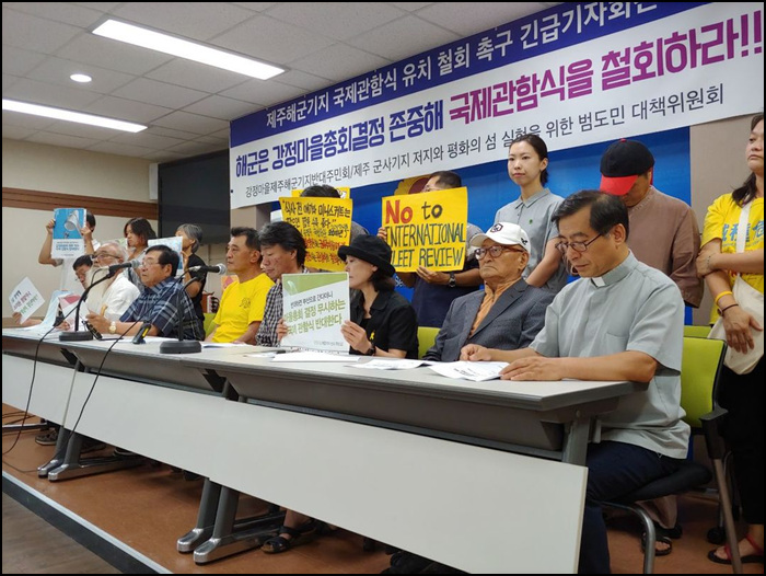 도내 28개 정당과 시민사회단체 등으로 구성된 제주군사기지저지와평화의섬실현을위한범도민대책위원회(이하 ‘범도민대책위)와 강정마을해군기지반대주민회(이하 ’반대주민회‘)는 11일 오전 11시, 제주도의회 도민의방에서 기자회견을 열고 “해군은 강정마을 주민총회의 결정을 존중해 국제관함식을 철회하라”고 요구했다.