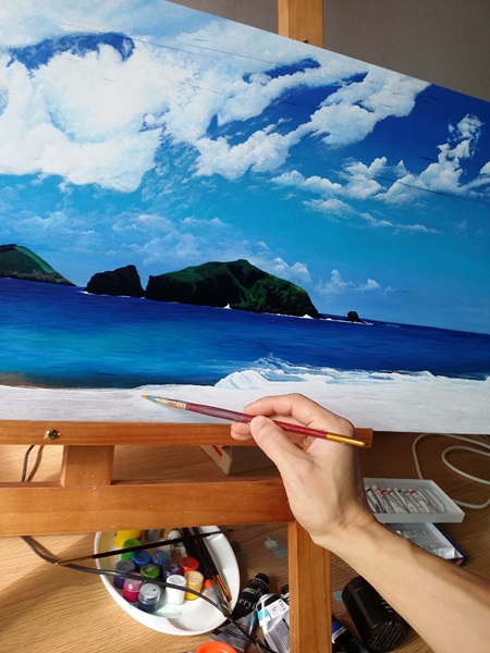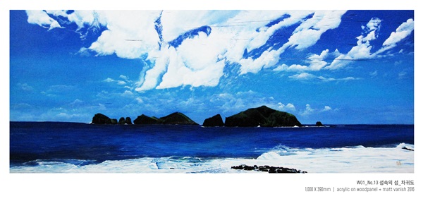 제주 바다를 보면서 마주하게 된 또 다른 섬은 수평선과 파도 그리고 쾌청한 하늘 속 하얀 구름까지 푸르게 맑음이 있어서, 계속 붙잡고 싶은 풍경을 화폭에 담아 두었다.