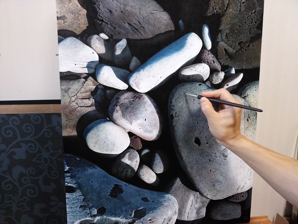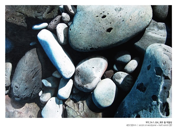 흙 따위가 굳어서 된 광물질의 단단한 덩어리인 돌은 환경에 따라서 날카로워지고 차가워지기도 할 텐데, 작가는 오랜 시간 파도에 견뎌낸 동글동글하고 따뜻함을 품고 있는 돌을 바라고 있다.
