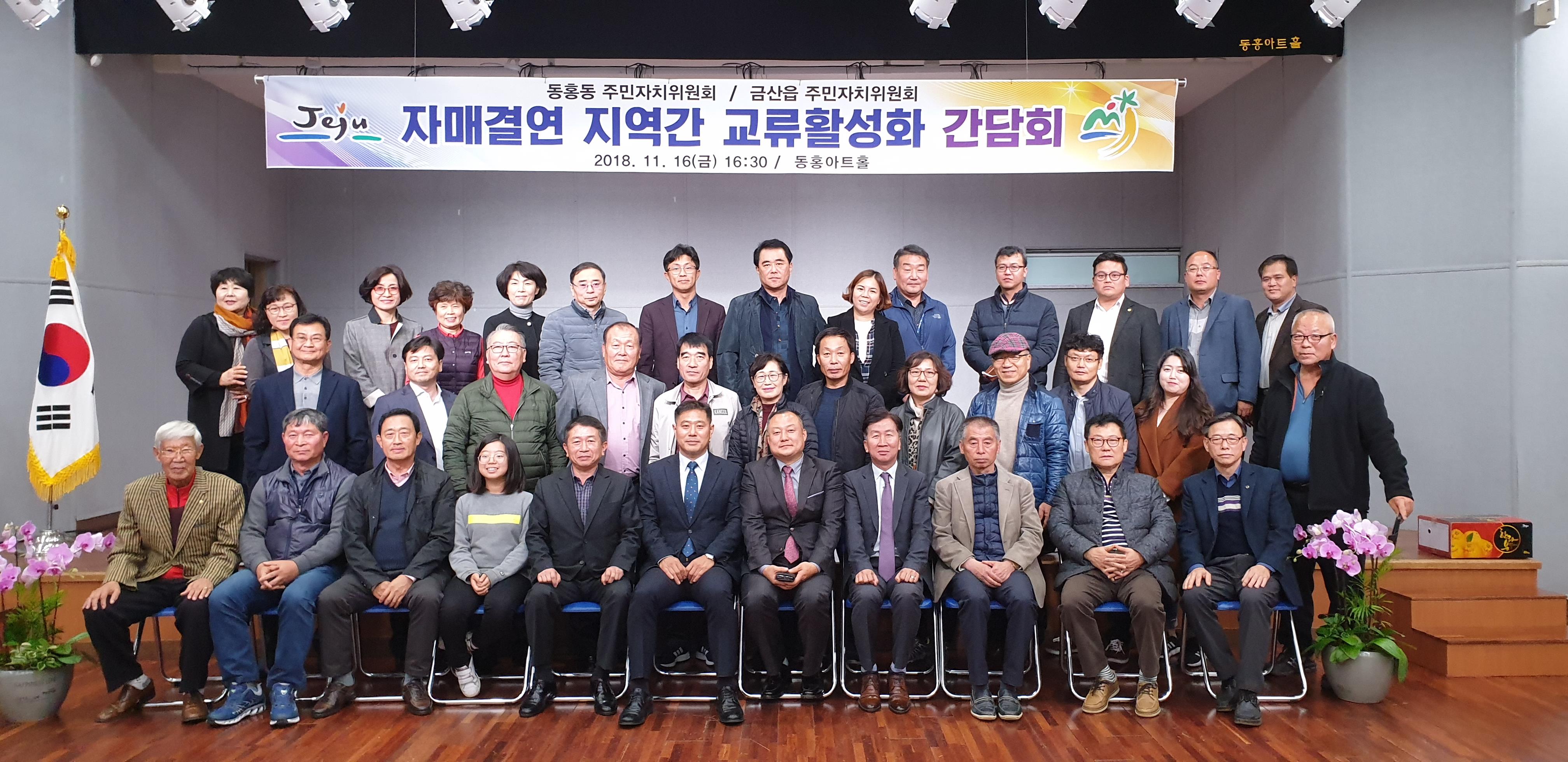 동홍동(동장 오창섭, 위원장 현봉식)은 자매결연지역인 충남 금산읍(읍장 박영하, 위원장 한정만) 주민자치위원 일행을 맞아 양측 주민자치위원 40여명이 참가한 가운데 지난 16일 동홍아트홀에서 교류활성화 간담회를 개최했다.