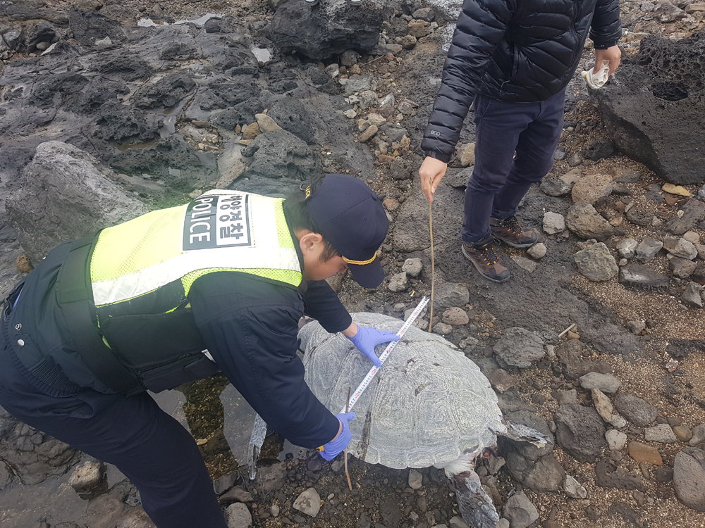 서귀포해양경찰서(서장 조윤만)는 25일 오전 10시 19분경 강정포구 서쪽 약 500m 펜션 건축현장 앞 해안가에서 푸른바다거북 사체가 발견됐다고 밝혔다.