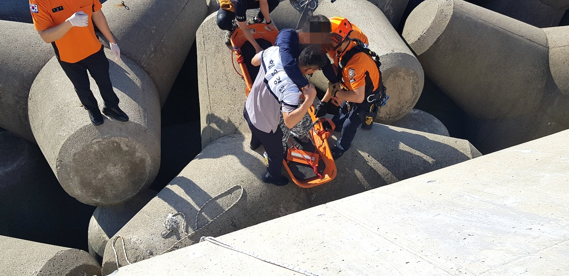 낚시 장소로 이동하기 위해 방파제 테트라포트 위를 걷던 주민이 방파제 아래로 추락하는 아찔한 사고가 발생했다. 다행히 해경과 119대원들이 출동해 주민을 구출했다.