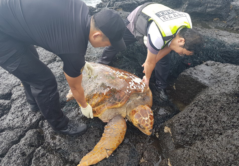 서귀포해양경찰서(서장 김언호)에 따르면 27일 오전 9시 2분경 성산읍 온평리 해안가를 산책하던 관광객이 폐그물에 걸려 있는 바다 거북을 발견하고 신고했다.