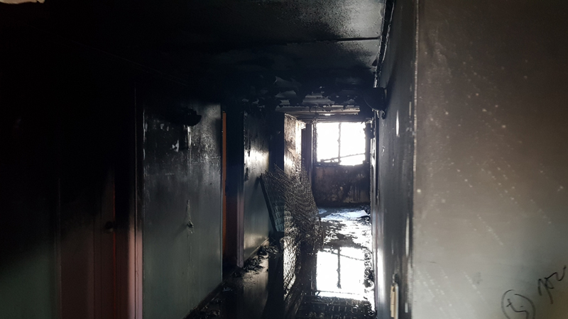불은 건물 입구계단 벽과 내부 33㎡와 가구, 정수기 등을 태우고 진화됐다. 소방서는 1318만 원 상당의 피해가 난 것으로 추정했다.