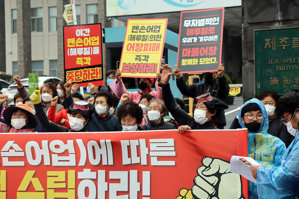 그런데 해양관광이 어민들의 생존을 위협한다는 문제가 제기됐다. 대평리 주민들은 16일 오전 제주도청 앞에서 기자회견을 열고 해루질(맨손어업)의 폐해를 집중적으로 토로했다.