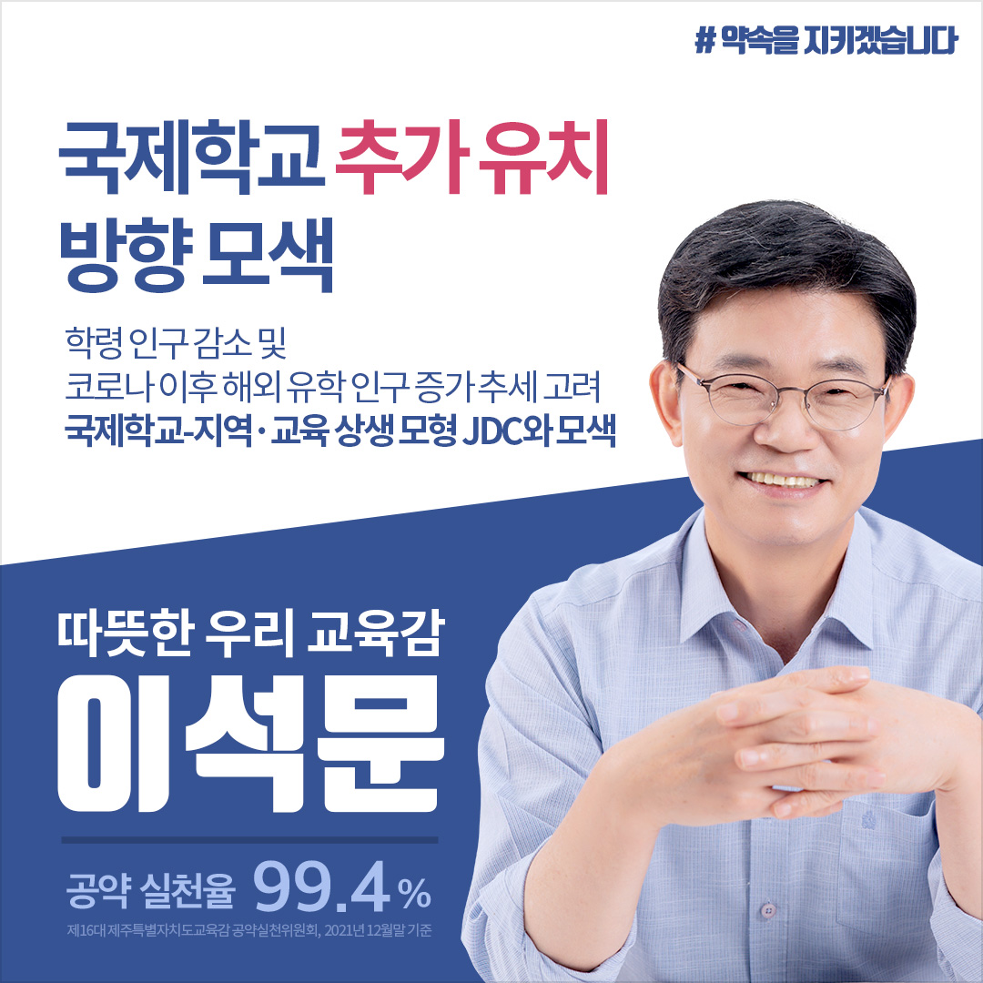 이석문 후보는 “재임 기간 중에 도내 교사들을 국제학교에 파견 보내 전문 역량을 쌓게 하고 이를 제주 학교 현장에 활용하도록 했다”라며 “이처럼 JDC와 함께 국제학교와 상생할 수 있는 모형을 충분히 발굴, 확대할 수 있다”라고 말했다.