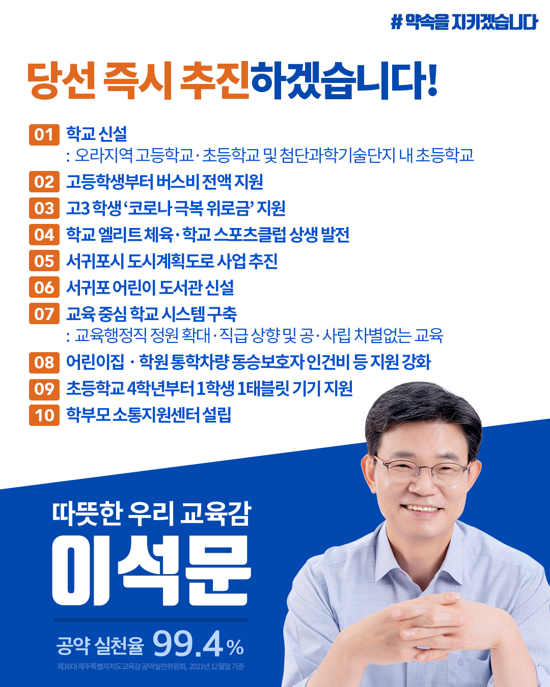 이석문 제주특별자치도교육감 후보는 5월 30일, <당선 즉시 추진할 10대 공약>을 발표했다.