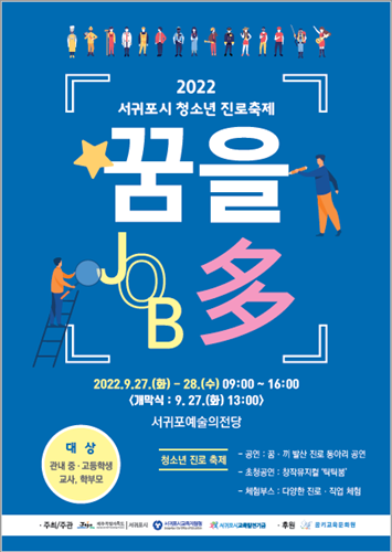 서귀포시교육지원청(교육장 김영대)은 오는 9월 27일부터 28일까지 서귀포예술의전당에서 2022 서귀포시 청소년 진로축제‘꿈을 job多’를개최한다.