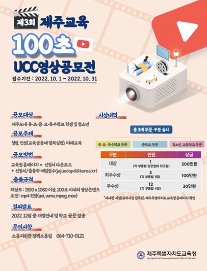 제주특별자치도교육청(교육감 김광수)은 29일,‘제3회 제주교육 100초 UCC 영상 공모전’(이하 공모전)을 개최한다고 밝혔다.