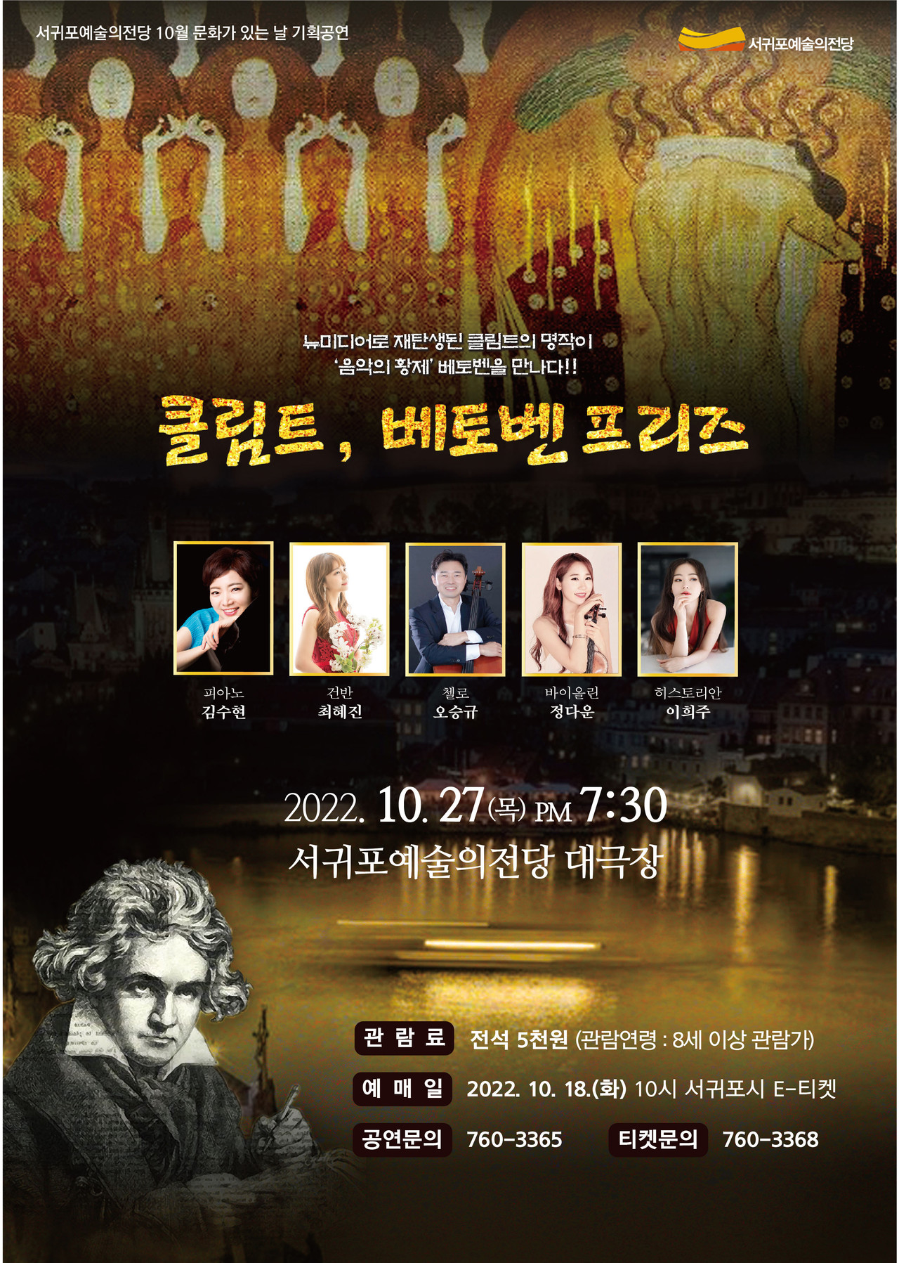 서귀포시는 10월 문화가 있는 날 기획공연으로 음악으로 그리는 명작 시리즈 <클림트, 베토벤 프리즈> 공연을 오는 27일 오후 7시 30분 서귀포예술의전당 대극장에서 개최한다.