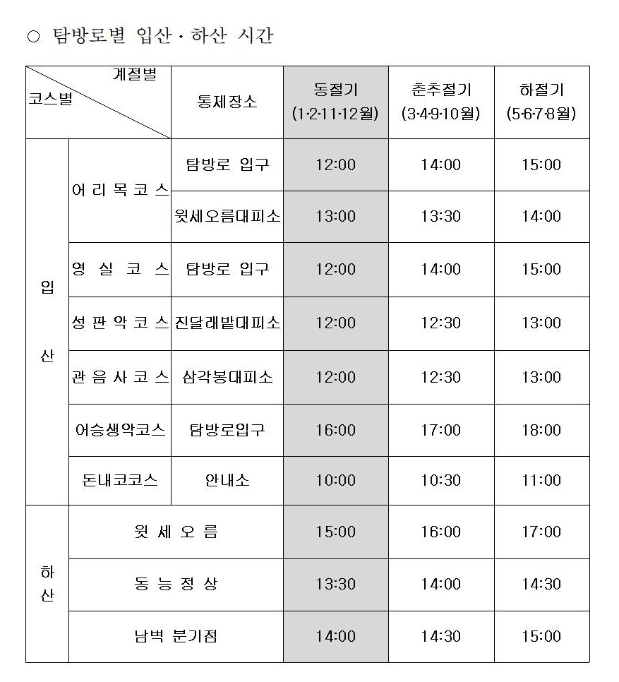 동절기 탐방로 입산 시간은 오전 6시로 코스별 입산 가능한 시간은 다음과 같다.