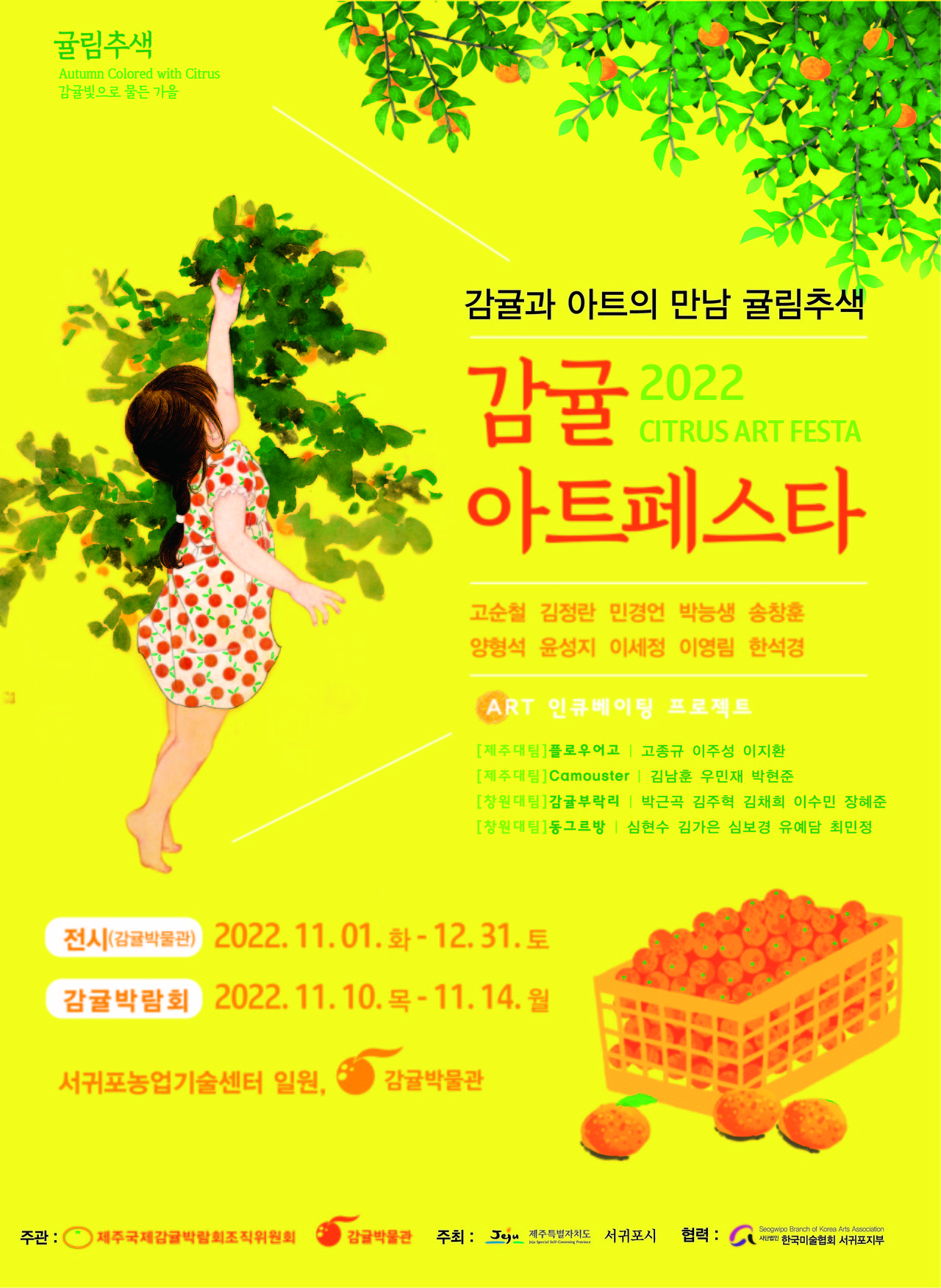서귀포시와 제주국제감귤박람회 조직위원회(위원장 양병식)가 공동 주관하고, 한국미술협회 서귀포지부가 협력하는 2022 감귤아트페스타 기획전시가 11월 1일부터 서귀포시 감귤박물관 기획전시실에서 문을 연다.