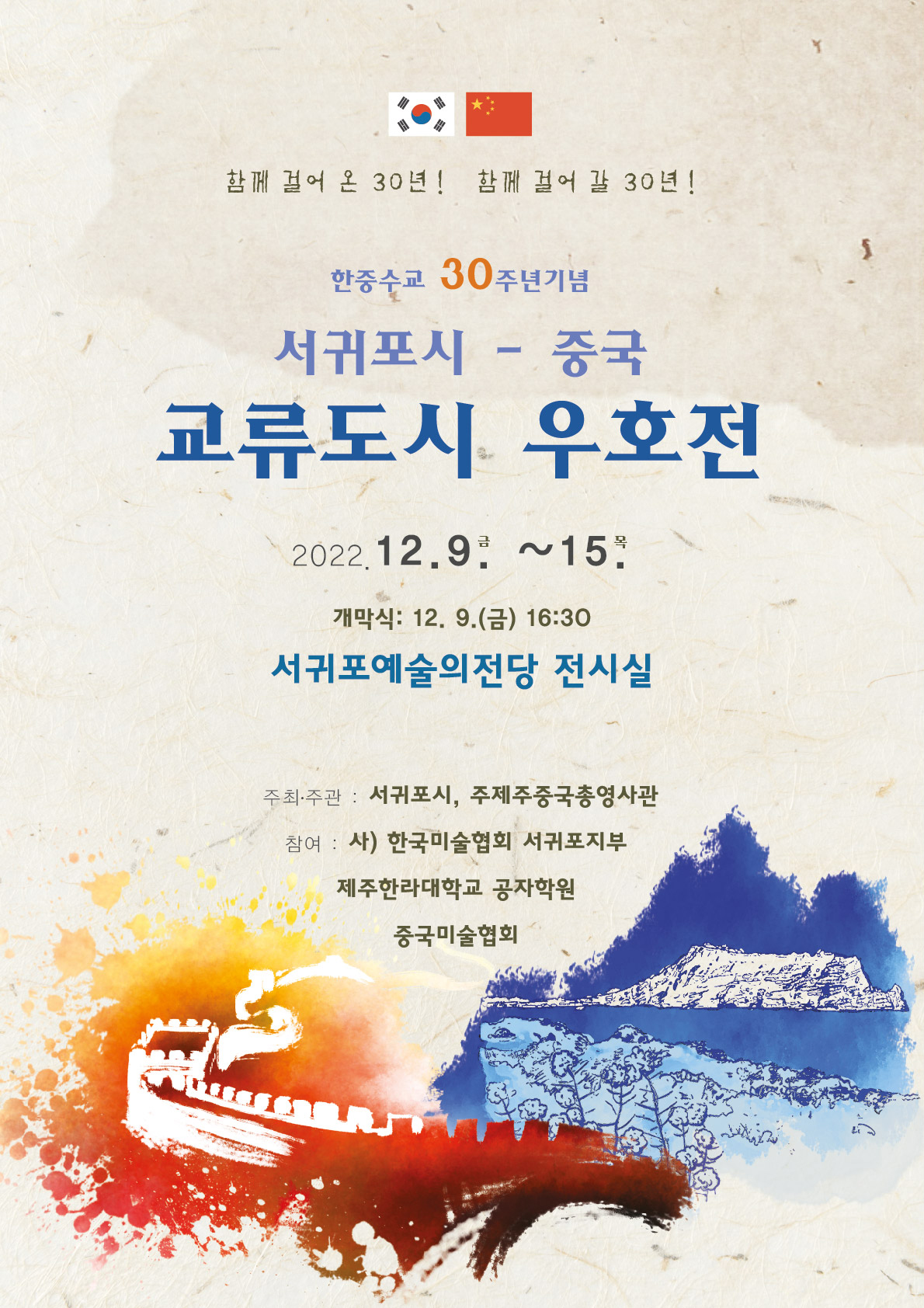 ‘함께 걸어 온 30년!, 함께 걸어 갈 30년!’을 주제로 진행되는 이번 행사는 서귀포시와 주제주중국총영사관이 공동 주최하고 서귀포시와 교류를 맺고 있는 6개의 중국 교류도시, 사) 한국미술협회 서귀포지부, 중국미술협회, 제주한라대학교 공자학원이 함께 참여한다.