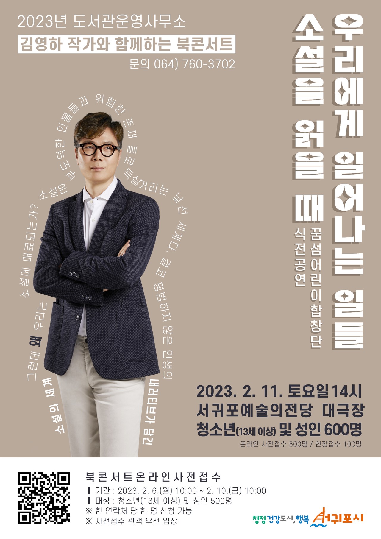 서귀포시는 오는 2월 11일 오후 2시 서귀포 예술의전당 대극장에서 김영하 작가를 초청해 <2023년 작가와 함께하는 북 콘서트> 행사를 개최한다.