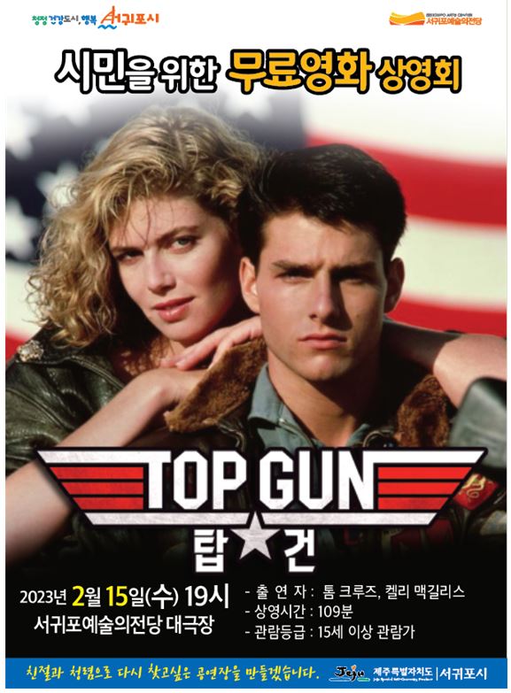 서귀포시는 오는 15일 저녁 7시 서귀포예술의전당 대극장에서 톰 크루즈 주연의 영화 「탑 건」을 영상으로 상영한다.