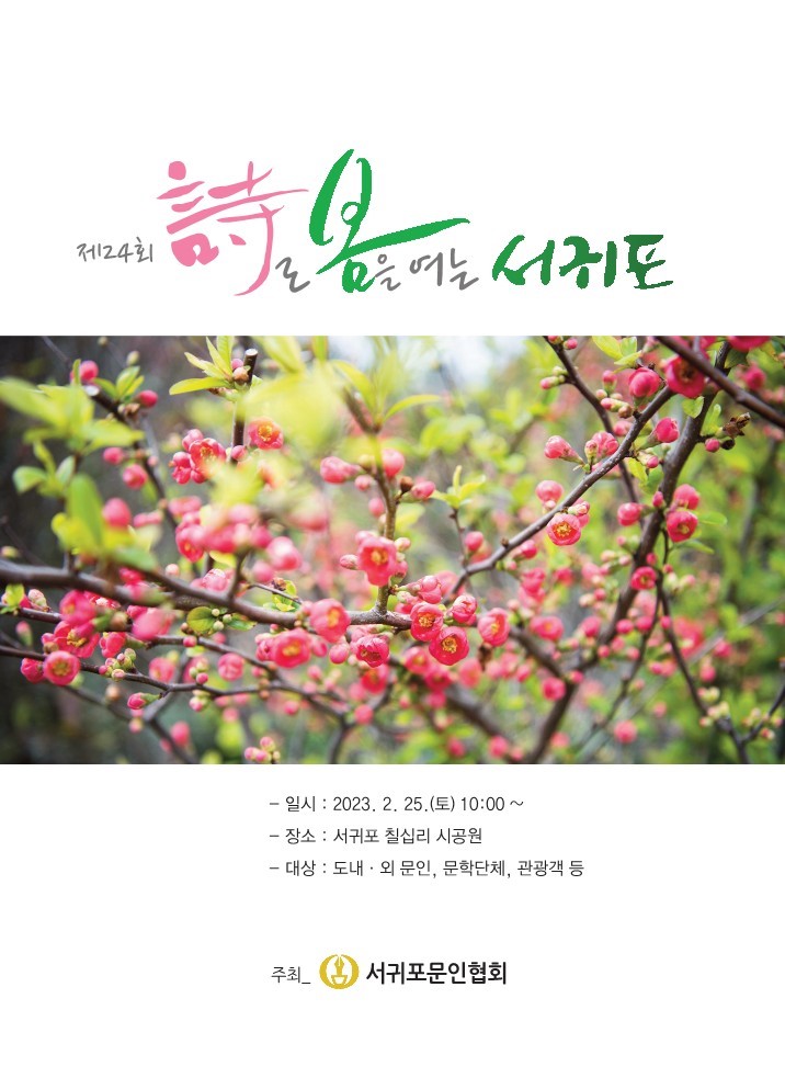 (사)한국문인협회 서귀포지부(지부장 정영자)는 25일, 서귀포칠십리 시공원 일대에서 도내·외 문인 100여 명이 참가한 가운데 제24회 ‘시로 봄을 여는 서귀포’행사를 개최한다.