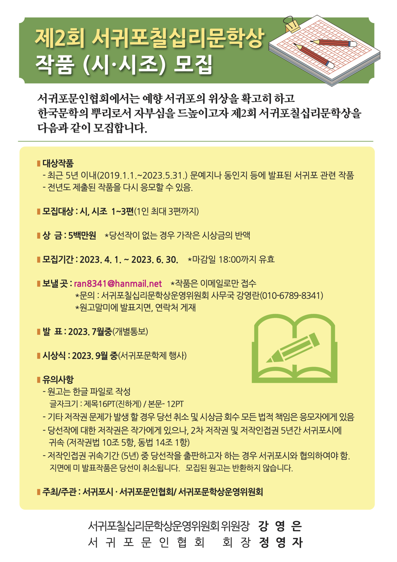 모집작품은 최근 5년 이내(2019.1.1.~2023.5.31.) 문예지나 동인지 등에 발표된 서귀포 관련 시와 시조 작품이며, 응모자 1인이 최대 3편까지 출품할 수 있다.