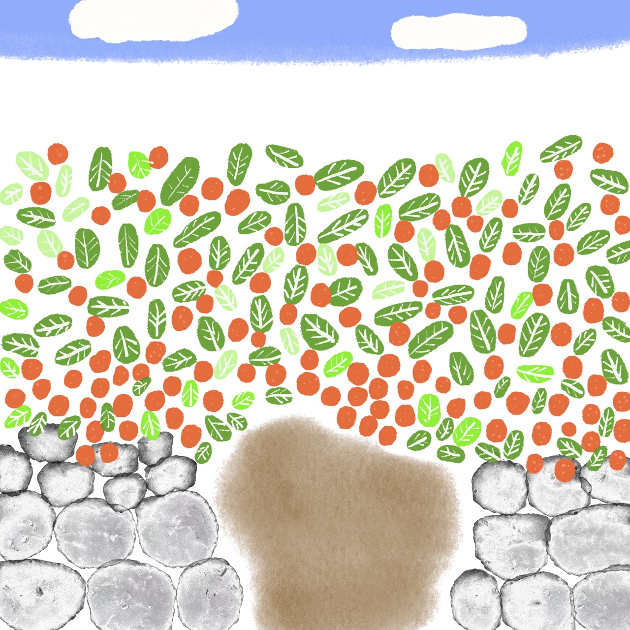 ‘돌, 귤, 동백’이라는 작품이다. 제주 돌담, 그 돌담 너머에 있는 귤나무 그리고 돌담에, 안에 자리 잡은 동백꽃의 일부분을 가지고 와서 돌담을 쌓듯 하나씩 쌓아서 작품을 완성했다. 대상을 단순화시켰지만 관객들이 대상이 무엇인지 알 수 있다. 작가는 보고 있으면 빙긋 웃을 수 있는 그런 따뜻한 귤밭의 풍경을 화폭에 담았다.