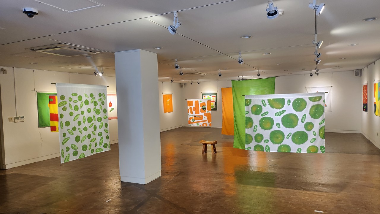 돌, 귤, 귤나무, 동백, 돌담이 원단에 단순하게 담겨 제주자연을 더욱 돋보이게 하는 전시회가 열리고 있다.