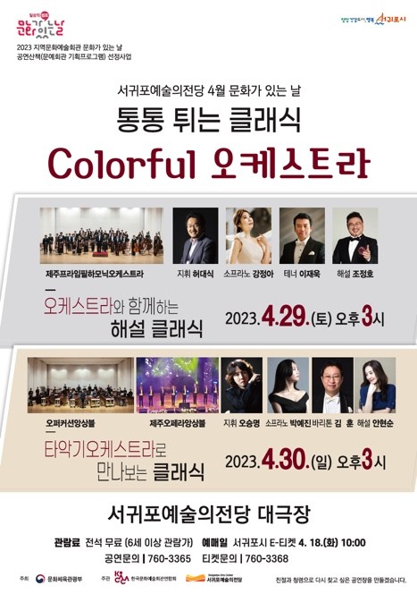서귀포시는 ‘2023년 지역문화예술회관 문화가 있는 날’ 공연산책 공모사업에 선정된 ‘통통 튀는 클래식 – Colorful 오케스트라’ 공연을 4월 29일과 30일 양일간 개최한다.