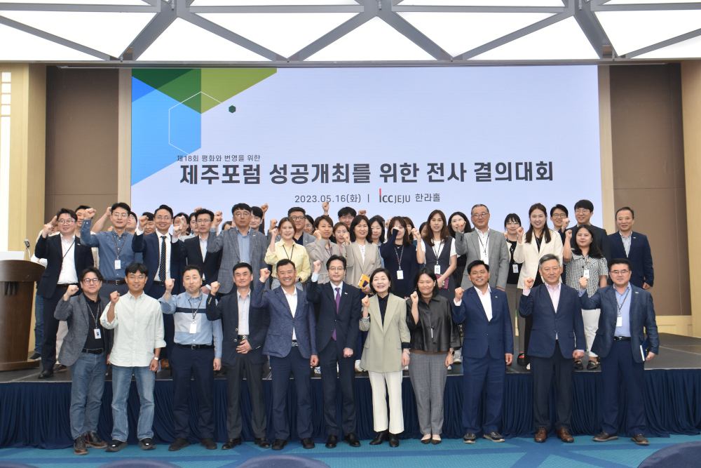 제주국제컨벤션센터(대표이사: 이선화, 이하 ICC JEJU)는 16일 제18회 평화와 번영을 위한 제주포럼(이하 제주포럼)의 성공적인 개최를 다짐하는 결의대회를 열었다.